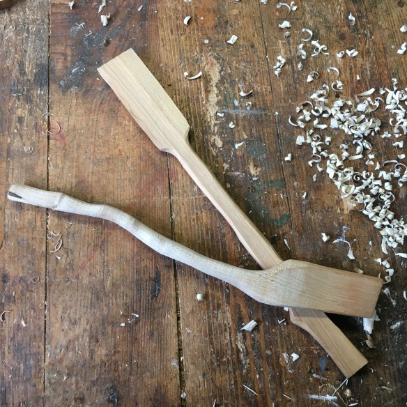 Using a drawknife askew on this elm creates long springy thick shavings. I’m making the legs for a carved oak bench, similar to a previous version I made earlier in the year.